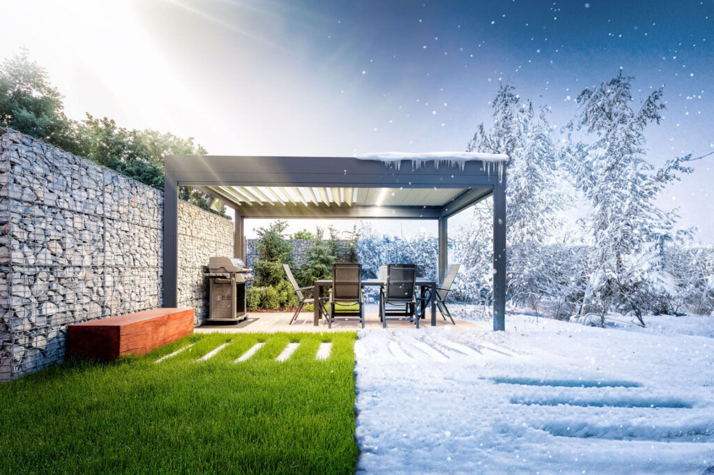 Bioklimatická pergola je konštrukcia, ktorá umožňuje prirodzene regulovať teplotu. Efektívnosť, udržateľnosť a inovácia ruka v ruke. Strop tvoria nastaviteľné motorizované lamely, ktoré viete cez diaľkový ovládač natáčať podľa potreby tienenia.